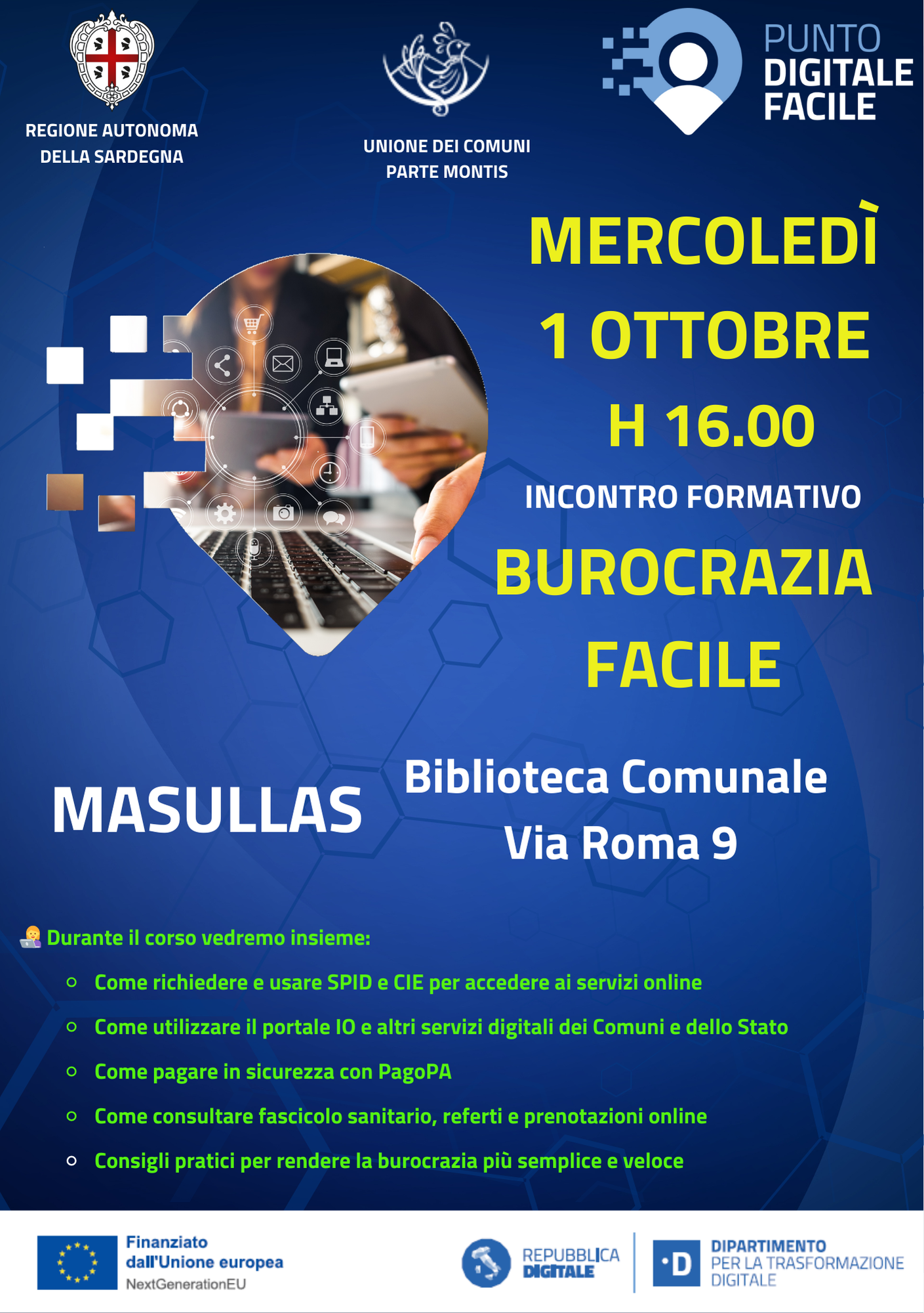 Siamo lieti di informarvi che, nell'ambito del progetto di Facilitazione Digitale, è stato attivato nei Comuni dell'Unione Parte Montis il corso di formazione "Burocrazia Facile".