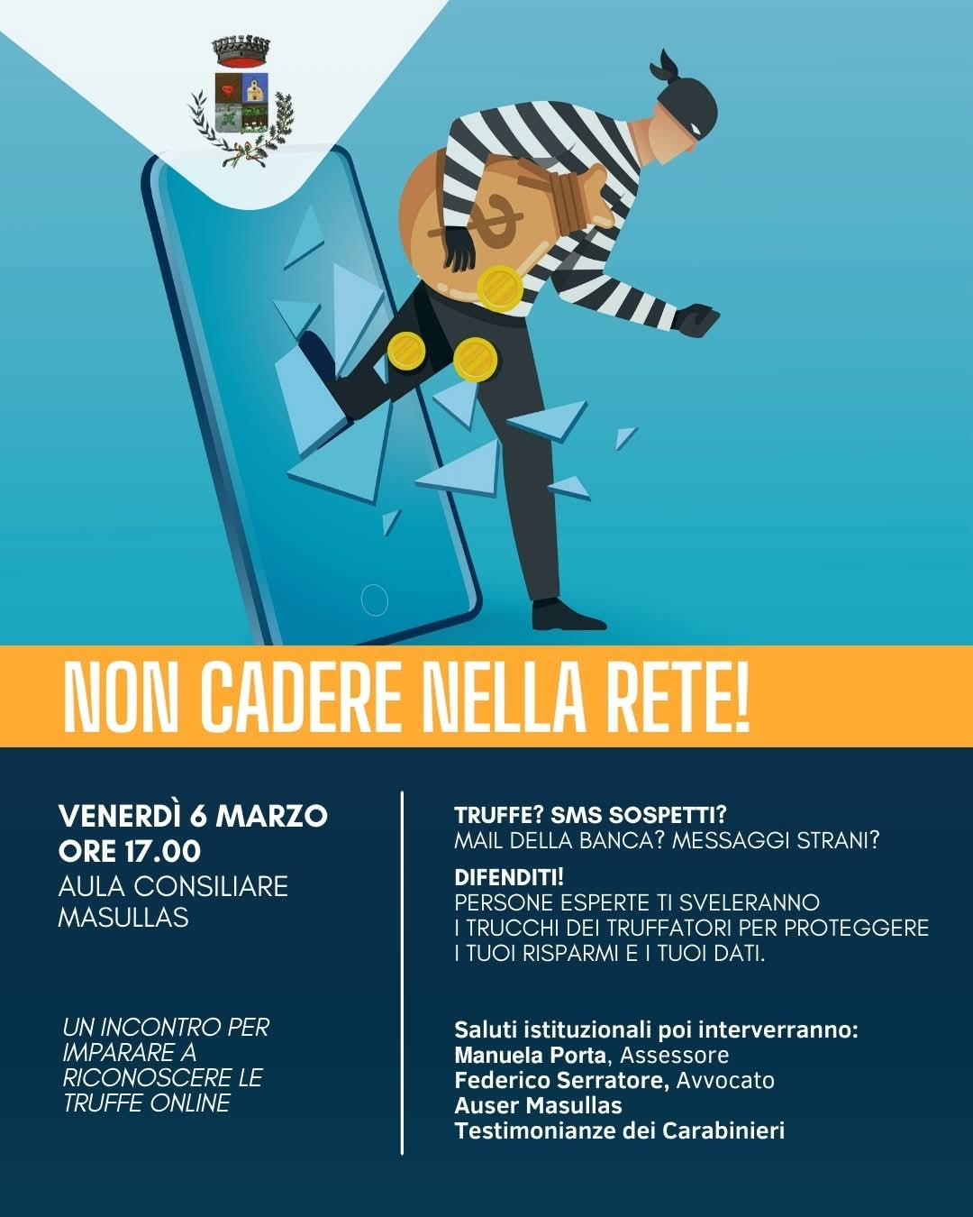 Venerdì 06 marzo 2026 h. 17:00 presso la sala consiliare del Comune di Masullas. Giornata di sensibilizzazione promossa dall'amministrazione comunale per prevenire e contrastare il fenomeno delle truffe ai cittadini. La giornata prevede interventi da parte degli esperti nel settore, informazioni alla cittadinanza, momenti di ascolto, dibattito e distribuzione di materiale informativo.
