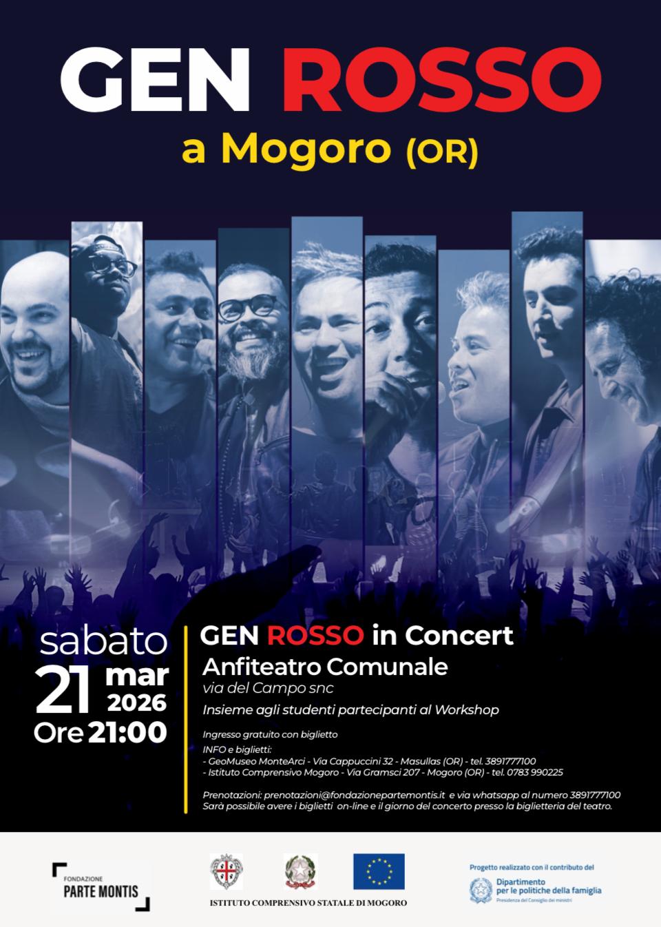 L’evento finale si terrà sabato 21 marzo 2026, alle ore 21:00, presso l’Anfiteatro Comunale di Mogoro, in via del Campo. Sul palco, l’energia e il messaggio del Gen Rosso si uniranno all’entusiasmo dei ragazzi che hanno preso parte ai workshop, dando vita a uno spettacolo intenso e ricco di significato.